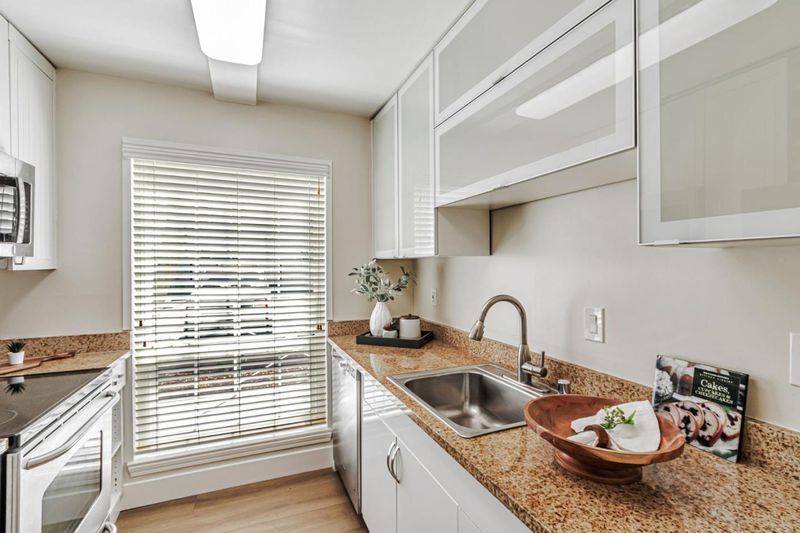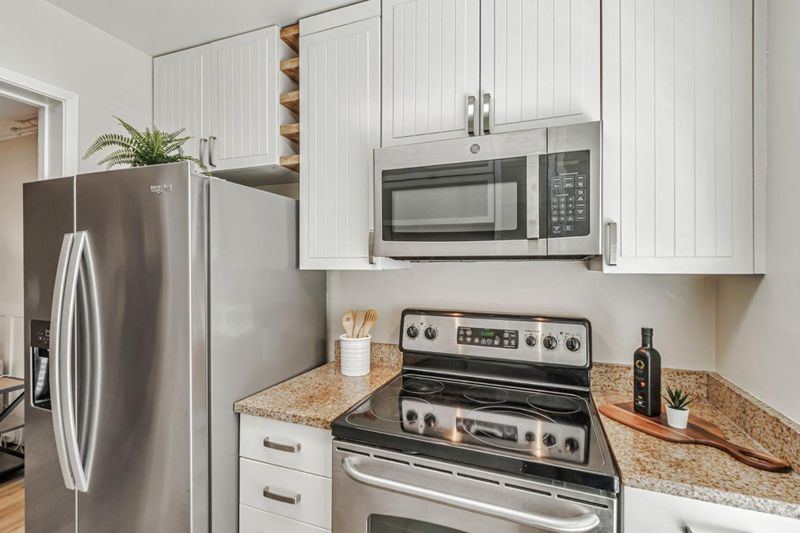 - 220 Volt Outlet, Countertop - Quartz, Exhaust Fan, Garbage Disposal, Microwave, Oven Range - Electric, Refrigerator