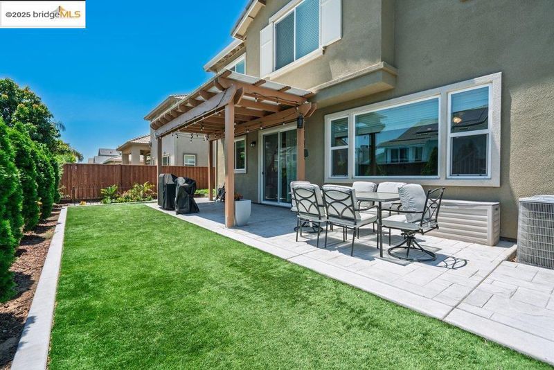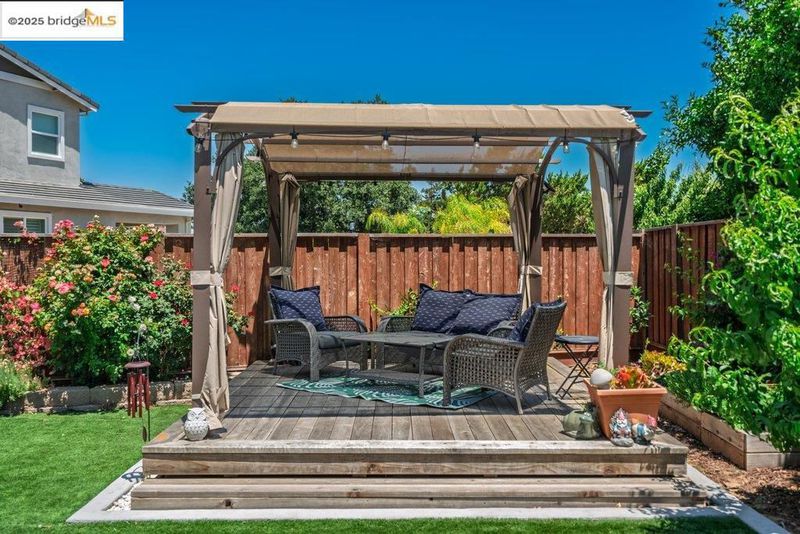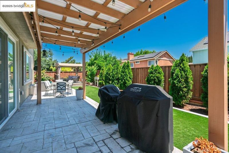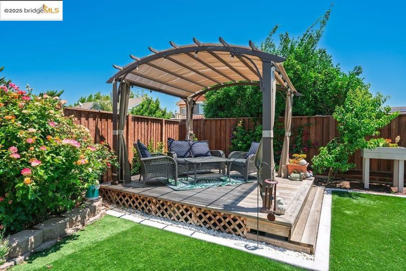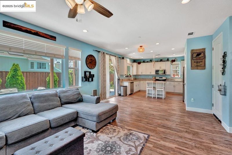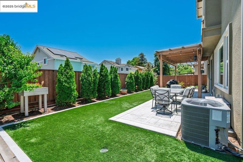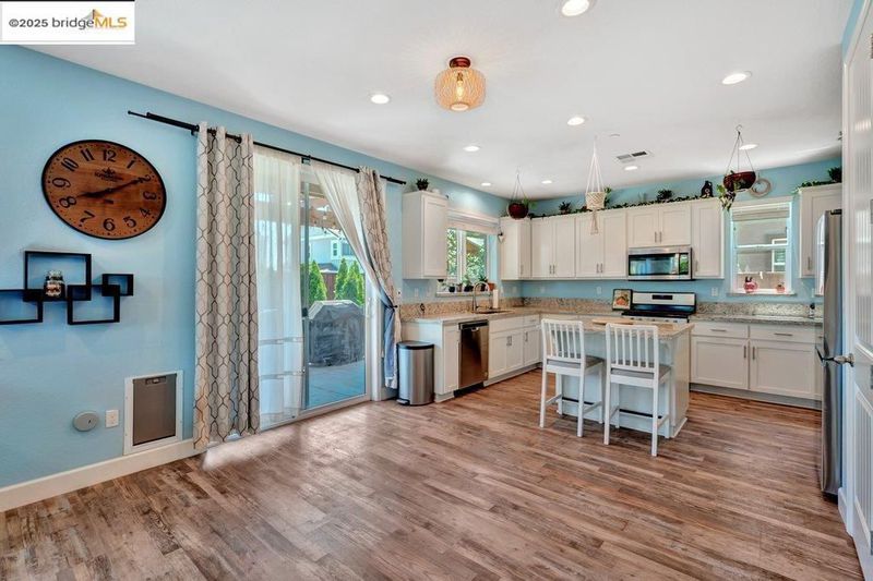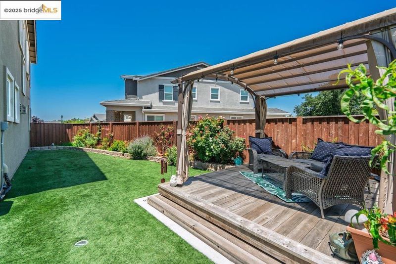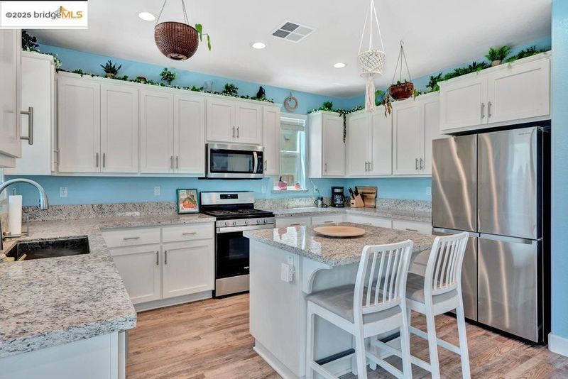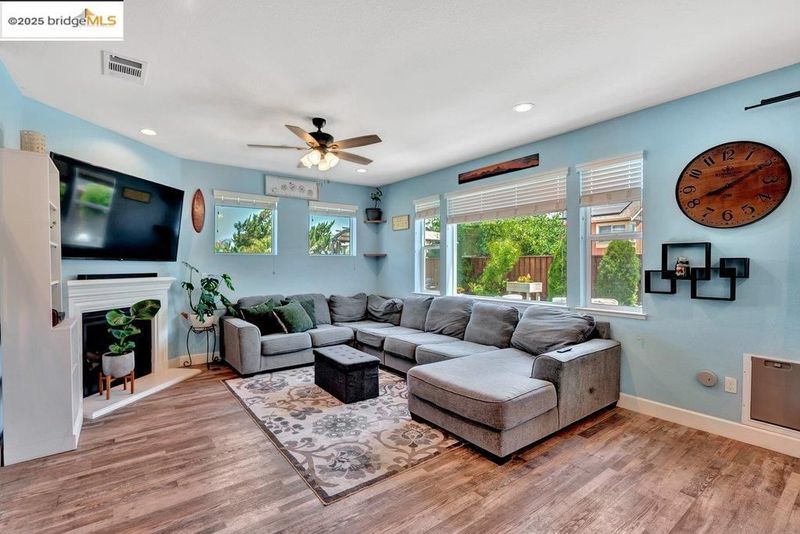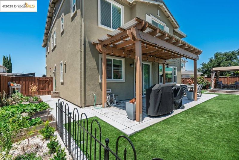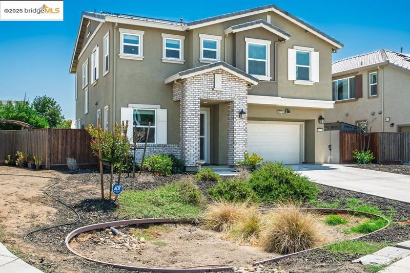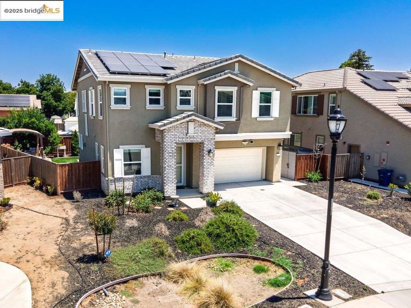 Welcome to this nearly new 5-bedroom, 3-bath home built in 2022. The open floorplan includes a modern kitchen with granite counters, stainless steel appliances, a breakfast bar, walk-in pantry, and dining area that flows into the main living space. A bedroom and full bath on the first floor offer flexibility for guests or multi-generational living. Upstairs features a loft, laundry room, and spacious primary suite with dual sinks, soaking tub, and separate shower. Energy-efficient upgrades include paid solar, a tankless water heater, and EV charging station. The backyard is low-maintenance with artificial grass, a covered patio, gazebo, raised garden bed, and elevated sitting area. Conveniently located near shopping, schools, parks, and freeway access.