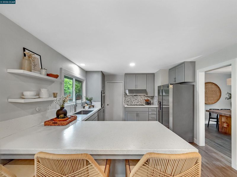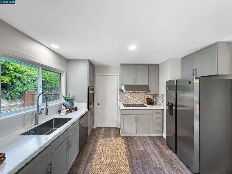 Electric Range, Refrigerator, Gas Water Heater, Counter - Solid Surface, Electric Range/Cooktop, Updated Kitchen
