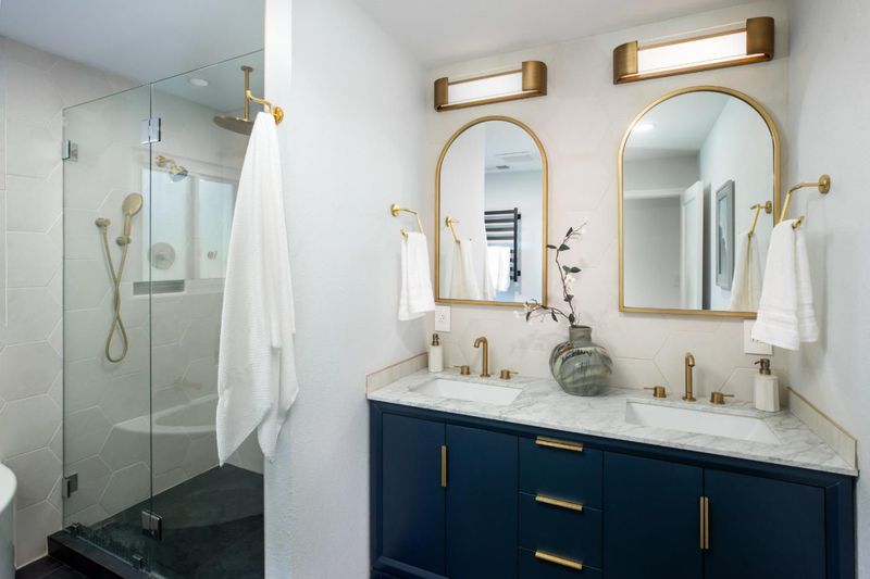 - Double Sinks, Full on Ground Floor, Primary - Oversized Tub, Primary - Stall Shower(s), Shower and Tub, Stall Shower, Stone