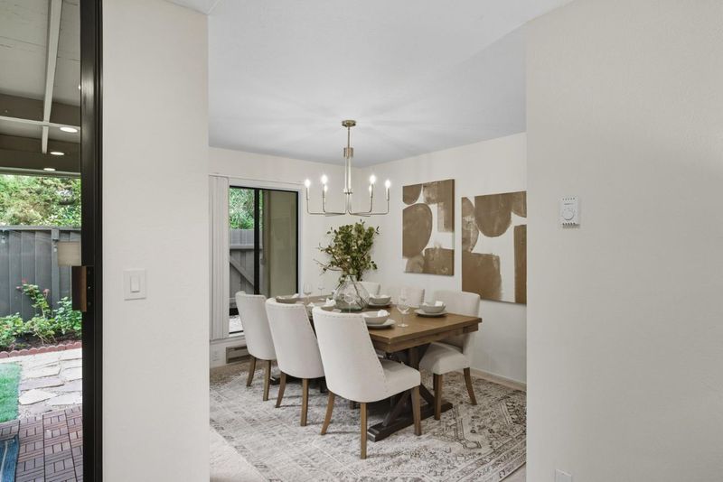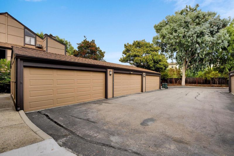 Freshly painted and move-in ready, this spacious ground-floor residence offers high-quality updates in a peaceful, tree-studded community. The remodeled kitchen features maple cabinets, quartz Carrara counters, a full tile backsplash, and stainless steel appliances including a smooth-top stove, microwave, dishwasher, and refrigerator. Porcelanosa gray-tone wood-look floors and recessed lighting flow throughout. The inviting living room highlights a wood-burning fireplace, custom white cabinetry, and a slider to the private fenced yard, while the dining area also opens to the outdoors for seamless entertaining. The bathroom showcases a double-sink maple vanity with quartz counter and Porcelanosa tile. A full-size washer/dryer, storage room, and landscaped patio add convenience. Includes one garage space and a parking pass. Just steps to the pool and approximately 1.5 miles to Google with easy access to major tech hubs.