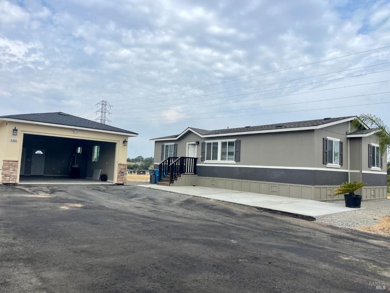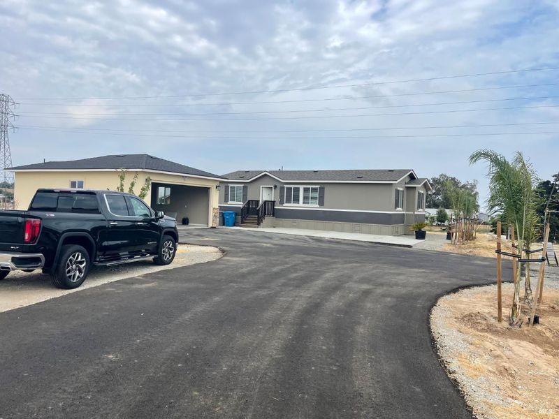 Welcome to this amazing double-wide manufactured home in a permanent foundation, this cute home is only three years old and is located less than four miles from downtown Vacaville. This property offers so much potential and opportunity for you to own a little slice of the country! With five flat usable acres you can expand and built your primary home while living in the current home. Property has a newer septic system built and almost ready to service two homes, per sellers the cost for this septic system was closed to 100K. The newer two car garages has a full bathroom the walls are textured and insulated and the Back office can be easily converted into an estudio/apartment. This is the perfect opportunity for you to enjoy the country living and enjoy the beautiful views of mountains and hills.
