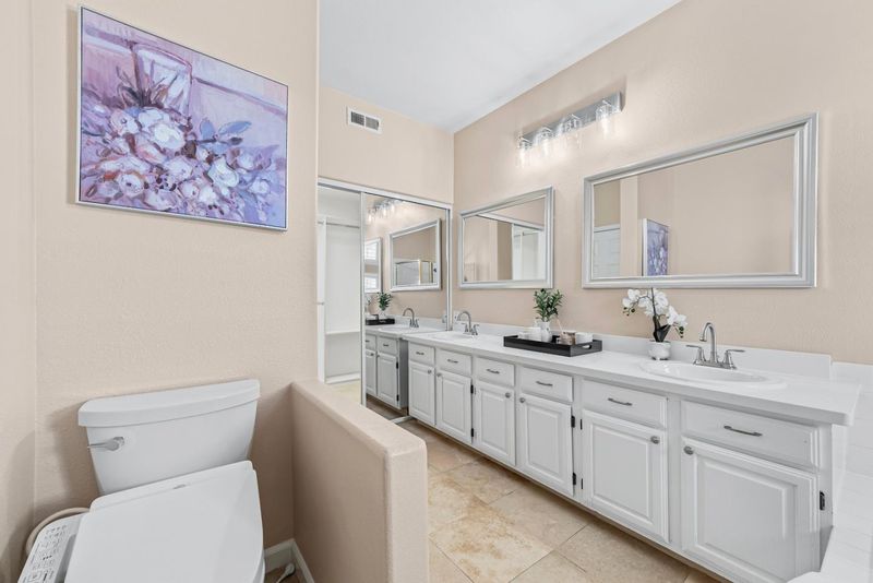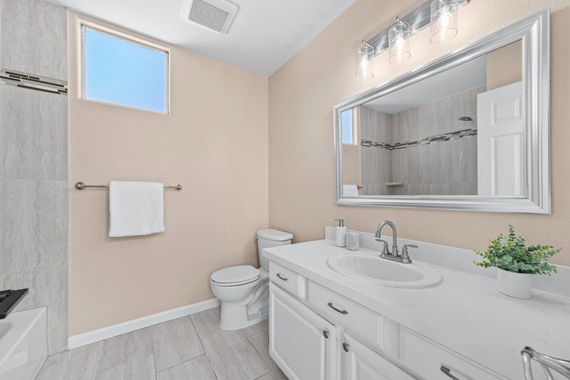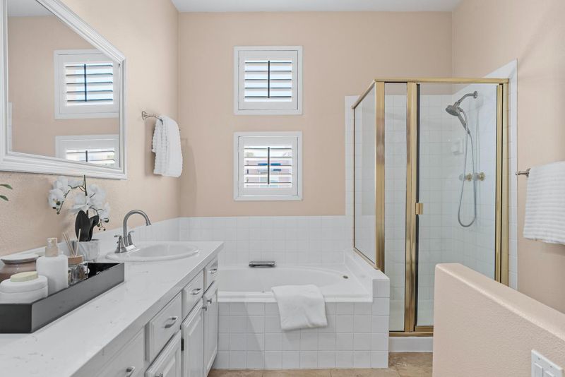 - Double Sinks, Shower and Tub, Tile, Tub in Primary Bedroom, Updated Bath, Half on Ground Floor, Primary - Oversized Tub, Primary - Stall Shower(s)