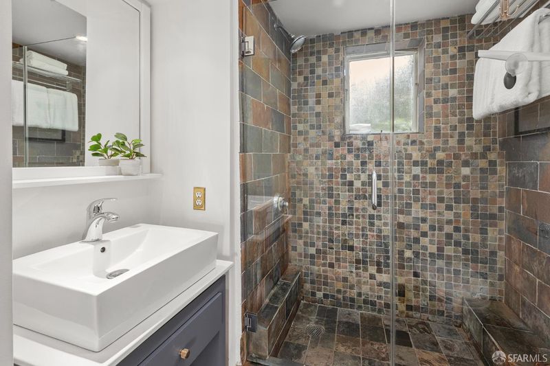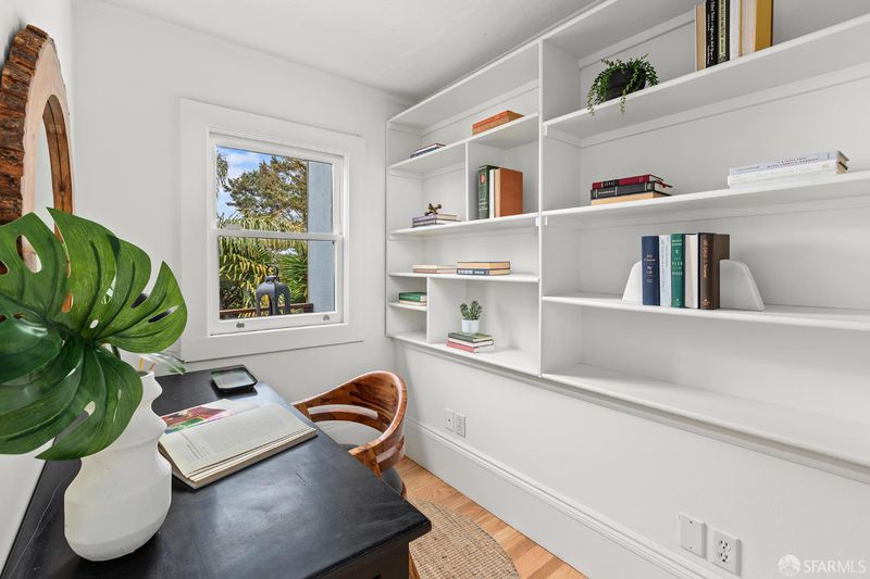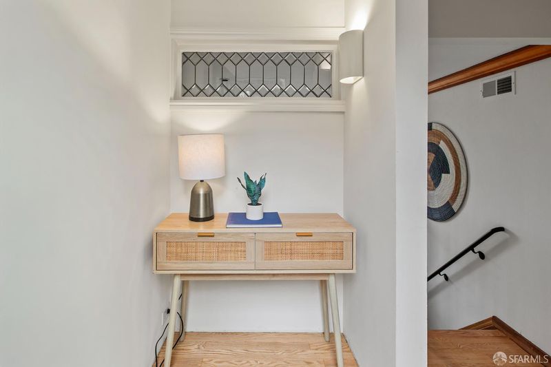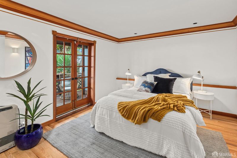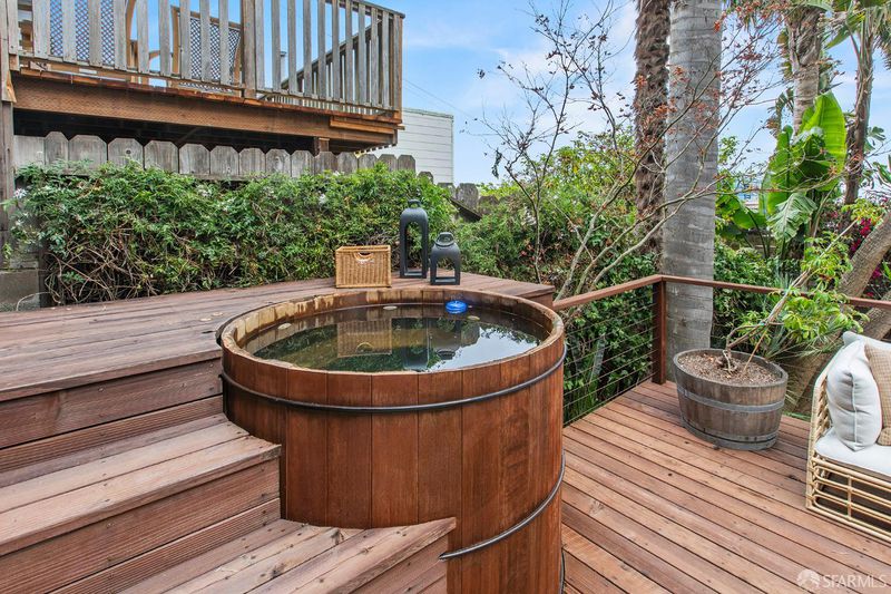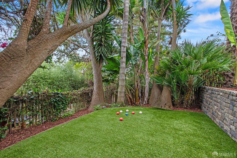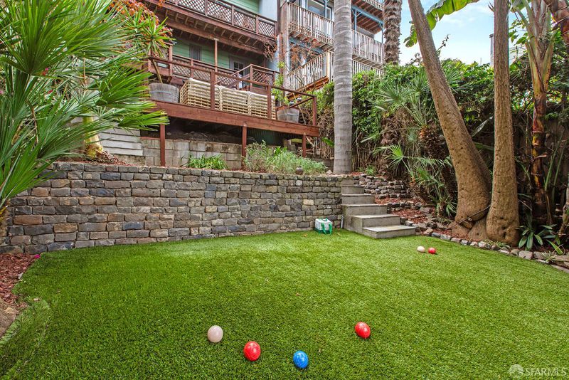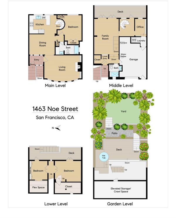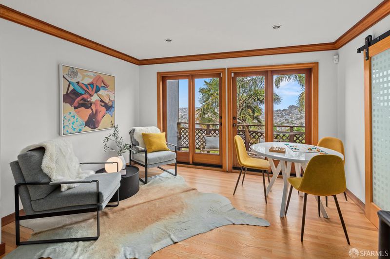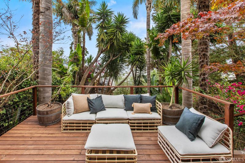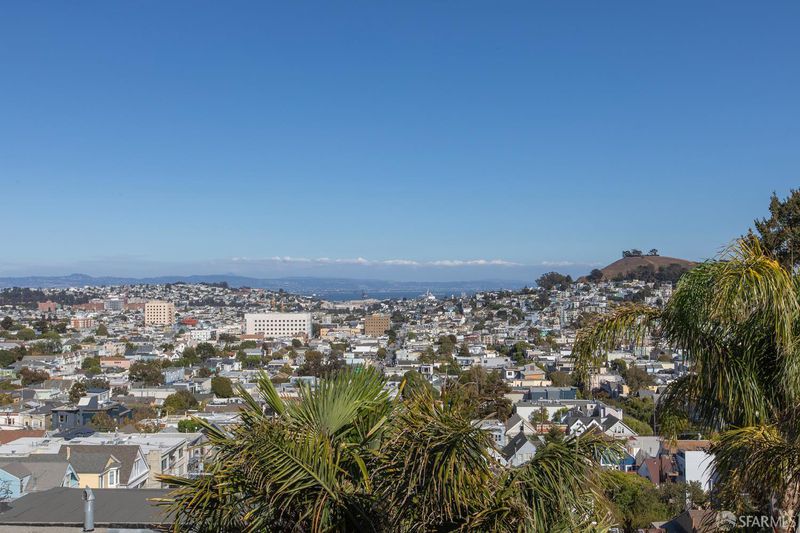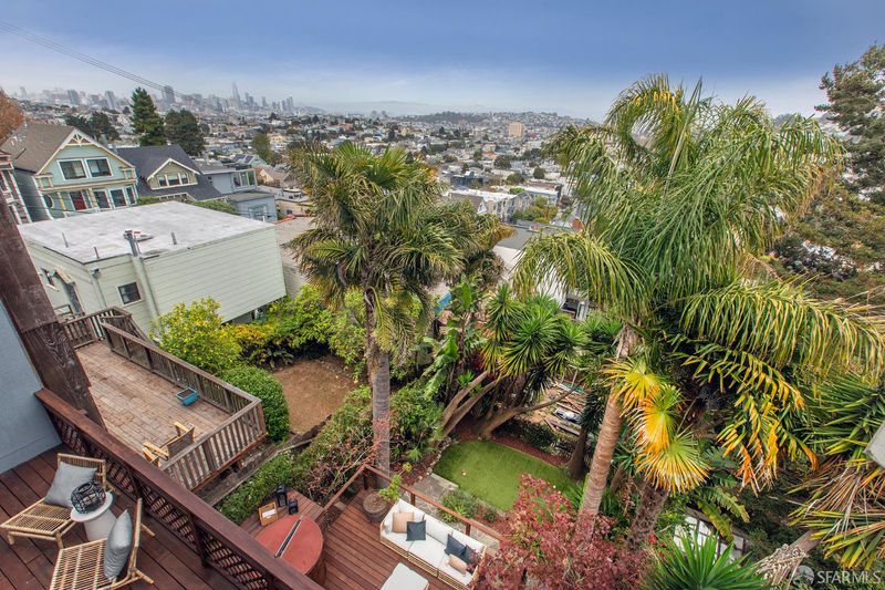 1463 Noe Street is a Mediterranean Revival residence spanning three levels with sweeping views of the downtown skyline and the bay. The main floor offers a living room with built-ins, coved ceilings, and a decorative fireplace, a formal dining room, and an east-facing kitchen where morning light fills the space, and the city stretches out below. The middle level features a spacious family room and a private office opening directly onto a wide view deck, creating a seamless extension of the living space. On the garden level, two additional bedrooms open to the lower deck and a lush backyard, where the outdoor spaces become a rare escape in the heart of the city. Decks step down to a patio and yard edged with mature palms and layered plantings that evoke a tropical retreat, complete with a hot tub and generous space for entertaining or quiet afternoons. Recent improvements include fresh interior and exterior paint, refinished floors, updated fixtures, and new kitchen countertops, giving the home a polished, move-in-ready finish. Garage parking, laundry, and generous storage complete the property, which sits on a quiet block between 27th and 28th Streets just minutes from Noe Valley's 24th Street corridor and Church Street cafs and restaurants.