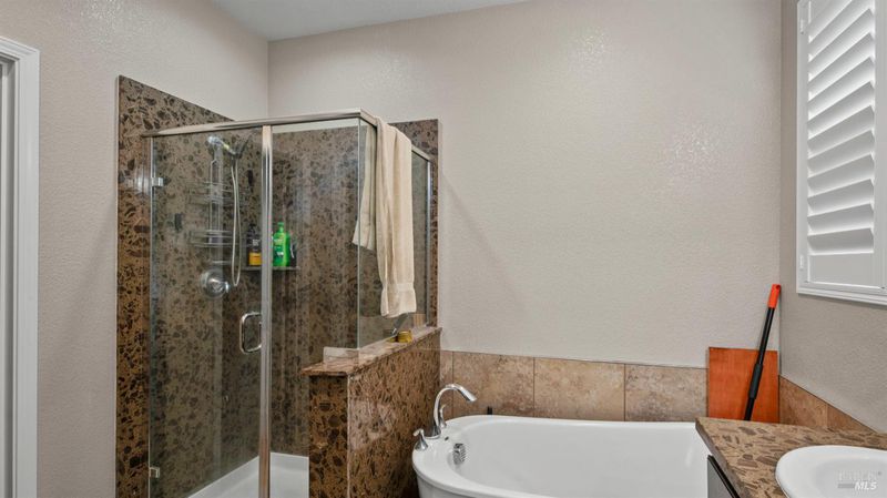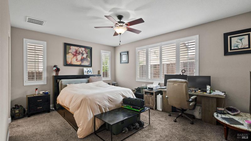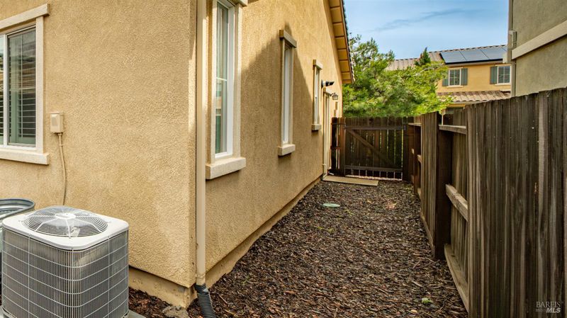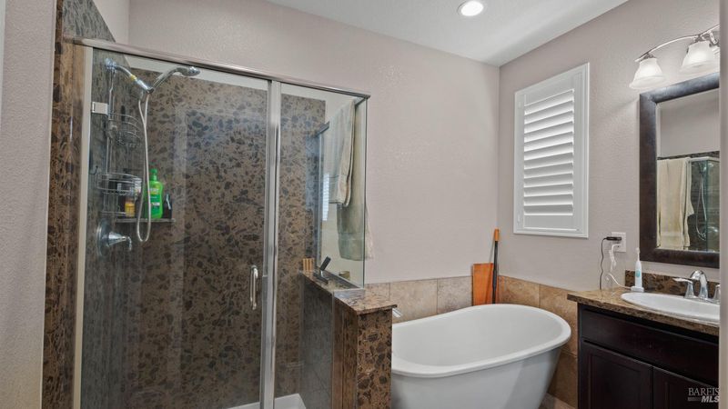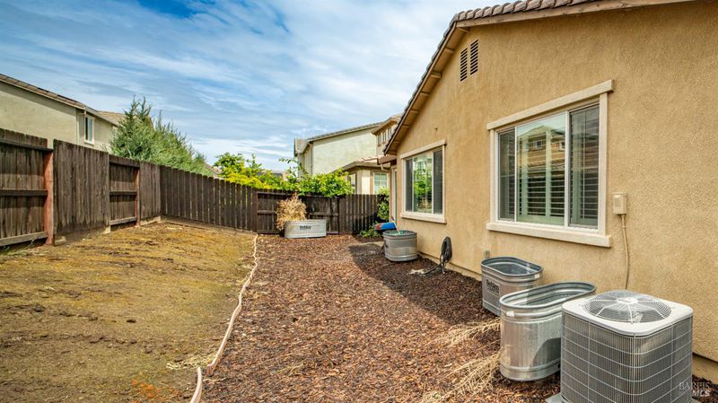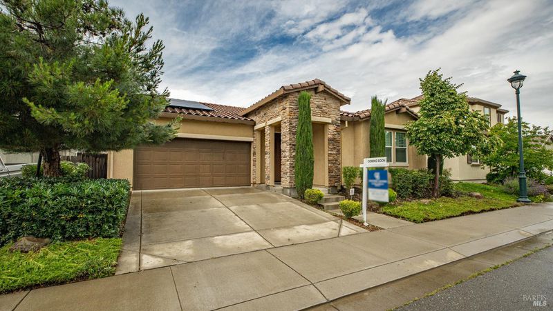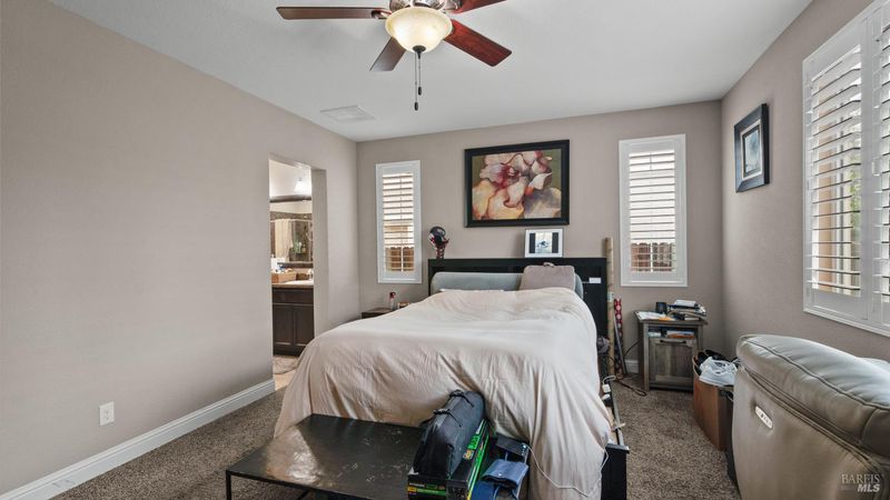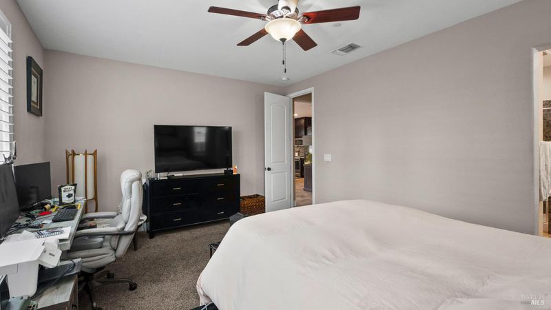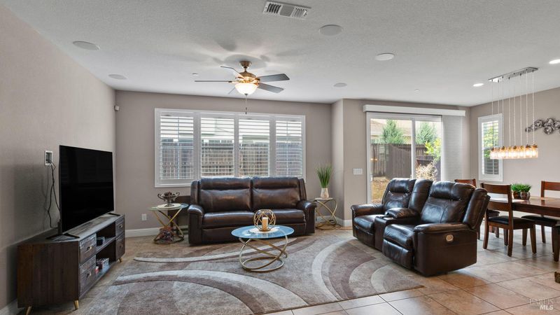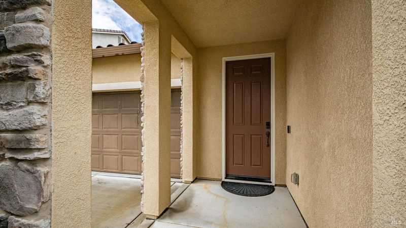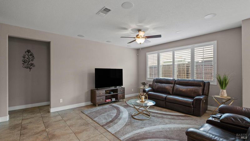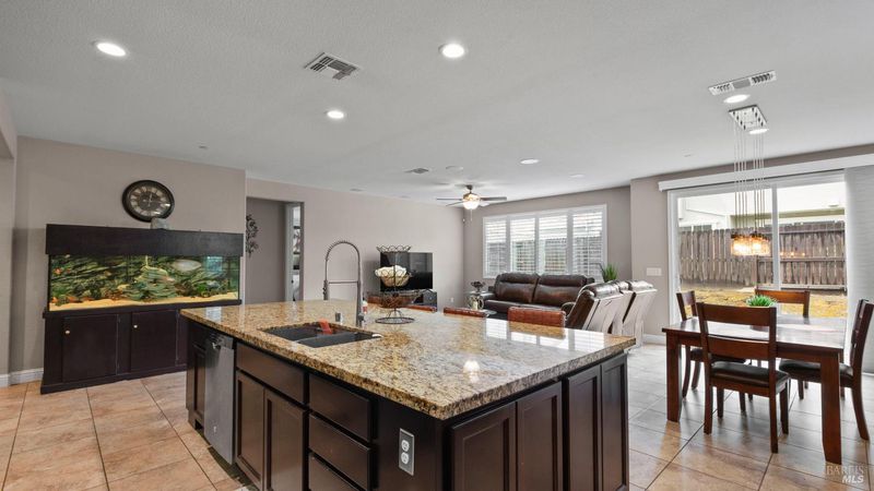 Beautifully maintained and move-in ready, this single-story home built in 2017 offers 3 bedrooms, 2 bathrooms, solar, and no HOA. A standout feature is the rare assumable VA loan in the low 3's for qualified VA buyers, creating an incredible opportunity in today's market. Designed with comfort and functionality in mind, the home features tile flooring and part carpet. Interior panel interior doors, and thoughtful upgrades throughout. The gourmet kitchen features a large island with a sink and bar seating, granite countertops, a decorative backsplash, stainless steel appliances, extra cabinetry, and a walk-in pantry. Interior shutters add style and charm. The spacious primary suite offers a sitting area, a walk-in closet, and a well-appointed bath with dual sinks, decorative mirrors, a soaking tub, and a separate shower. The hall bathroom includes a shower/tub combo and a vanity with cabinets. Additional highlights include an indoor laundry room with sink and cabinets, and a 2-car garage. Extremely well cared for and ready for its next owner, this home combines modern living, energy efficiency, and exceptional value in a desirable Vacaville location.