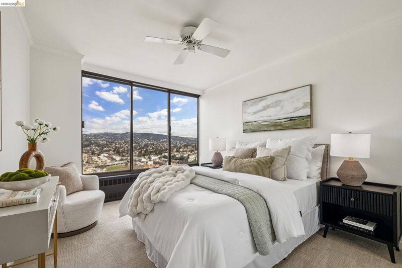 Stunning panoramic Lake Merritt, SF Bay and Oakland Hills view luxury 2B/2B Penthouse condominium. Expansive windows fill every room with natural light, showcasing these breathtaking water views and hillside vistas from every living area! Spacious open floor plan with hardwood floors and custom kitchen finishes highlighted by new quartz countertops with bar ideal for entertaining. Primary bedroom has ample closet space; primary bath has wonderful walk in shower perfect for aging in place. Park Bellevue is a full service luxury building with premier amenities including pool, fully equipped fitness center, sauna and elegant club room for gatherings and private events. Park Bellevue is perfectly positioned near dining, shopping and cultural destinations and employment centers. This a rare opportunity to own a luxury Penthouse home in one of Oaklands most desirable locations. This is true luxury living at its best!