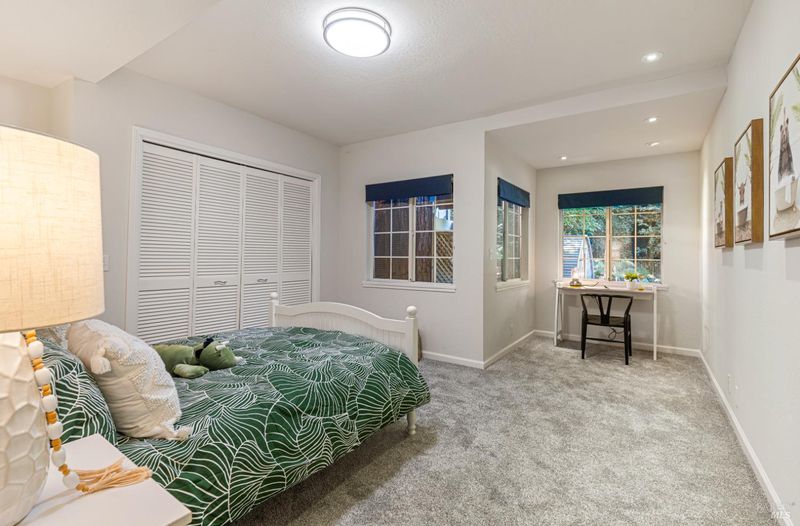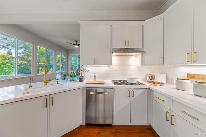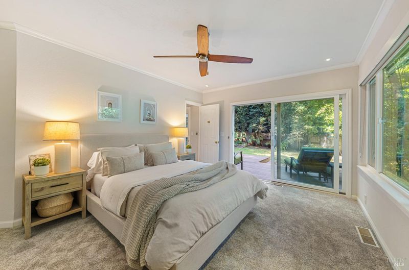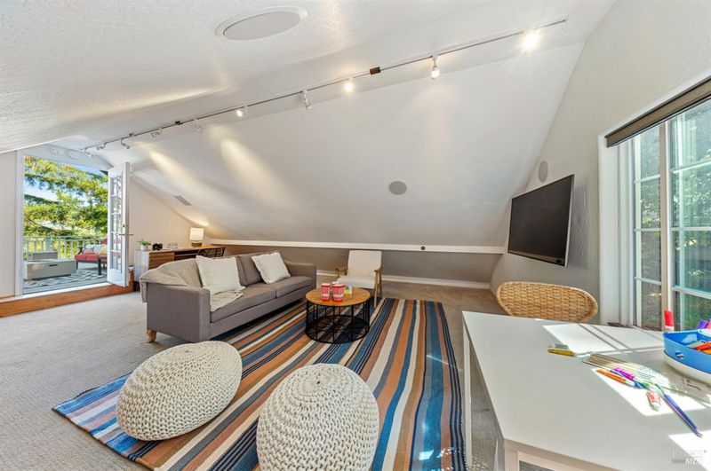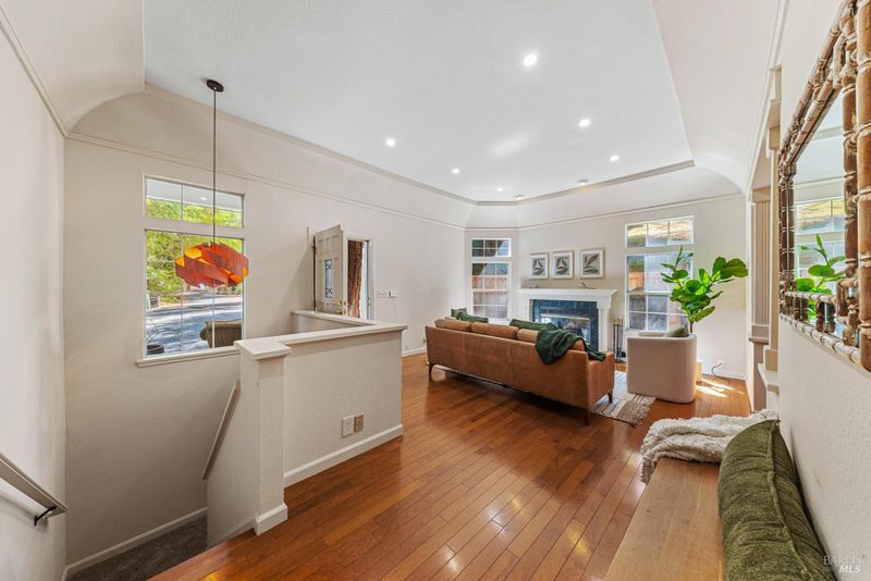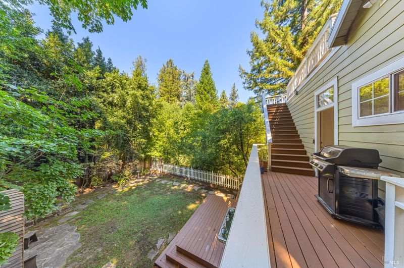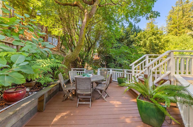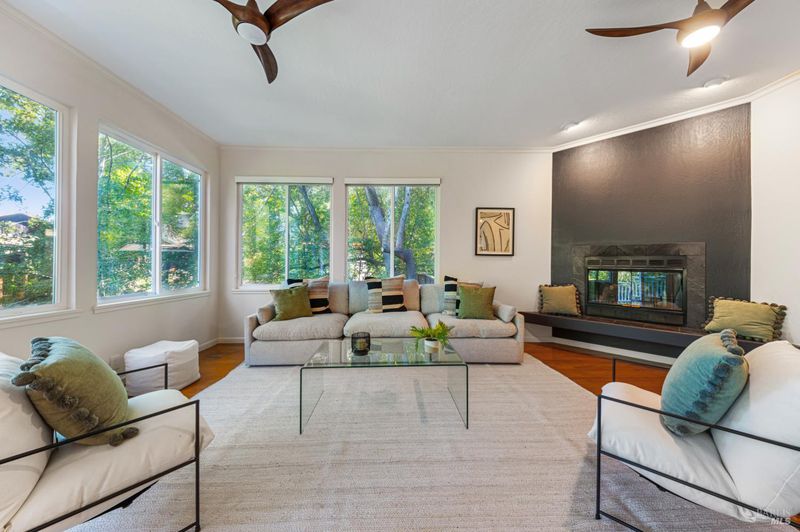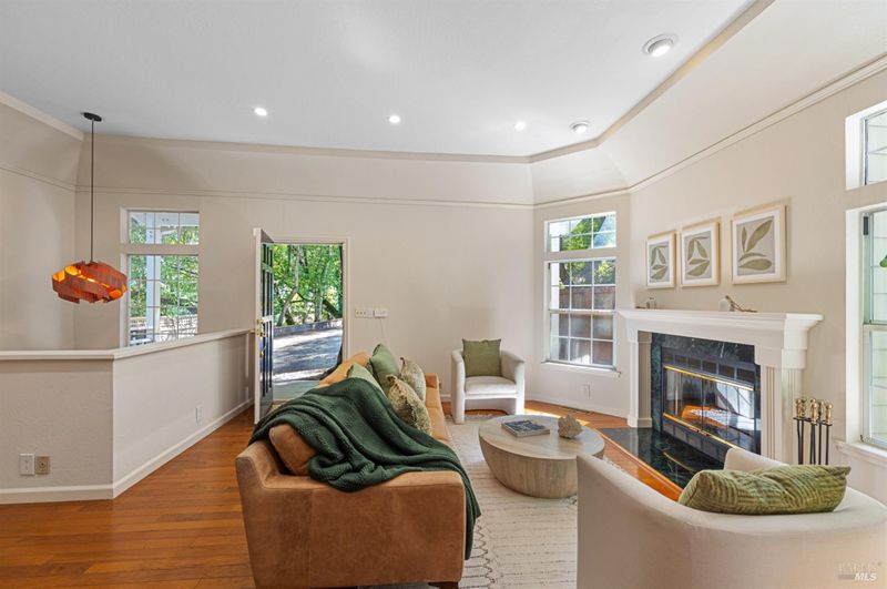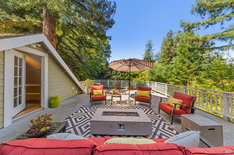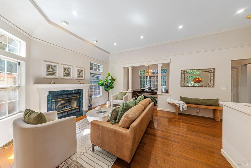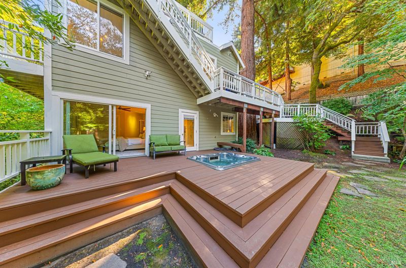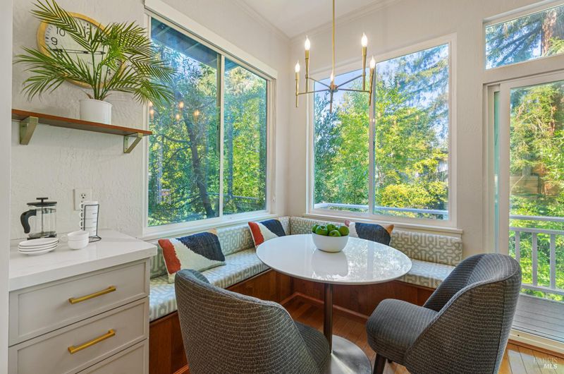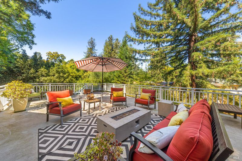 Peaceful and serene home on a quiet cul de sac where timeless charm blends seamlessly with thoughtful updates. The main living areas feature hardwood floors, crown molding, and tall ceilings. The inviting living room with a cantilevered ceiling and fireplace flows into the formal dining room, framed by elegant columns and view of a majestic redwood. The tastefully remodeled kitchen opens to a fabulous great room with fireplace, each with beautiful views, and features quartz countertops, stainless appliances, built-in banquette for casual dining and outdoor deck-perfect for morning coffee. A guest half bath, walk-in pantry and access to the spacious level fenced backyard complete the main level. Downstairs, you'll find all three bedrooms with new carpeting throughout. Primary suite offers French doors for privacy, remodeled bath with dual sinks, large shower, radiant heat and 2 closets. Sliding doors open to the backyard and hot tub. Two additional bedrooms, each with peaceful natural views, share a remodeled bath. A separate laundry room adds convenience. The rooftop deck provides an ideal space to relax or entertain, with adjacent bonus room perfect for home office, rec room, or quiet hideaway. Just minutes to downtown San Anselmo and Fairfax, and access to hiking/biking trails