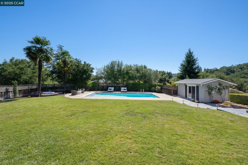 Discover versatile living and timeless sophistication in this traditional home on a premier 1.06-acre lot in Lafayette’s Upper Happy Valley. Designed as a true retreat with sweeping valley views, the property offers sunny outdoor spaces, level lawns, and expansive patios and decks for entertaining. Inside, a thoughtful floorplan with detailed millwork, hardwood floors, and soaring ceilings create a warm backdrop for everyday living. Most rooms are on the main level, while an upstairs suite offers flexibility as a second primary, guest retreat, or bonus space. The elegant dining and living rooms feature large windows, a fireplace, and French doors to the backyard. At the heart of the home, the kitchen with a generous center island opens to the family room and extends outdoors to the covered patio, lawn, and pool. The grounds are designed for both relaxation and entertaining, with a pool, hot tub, cabana with full bath and studio, and sauna. Minutes to downtown, shopping, BART, freeway, and top-rated schools.
