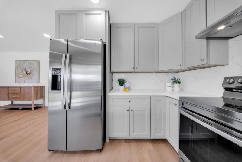 - 220 Volt Outlet, Countertop - Quartz, Dishwasher, Exhaust Fan, Garbage Disposal, Oven Range - Electric, Refrigerator