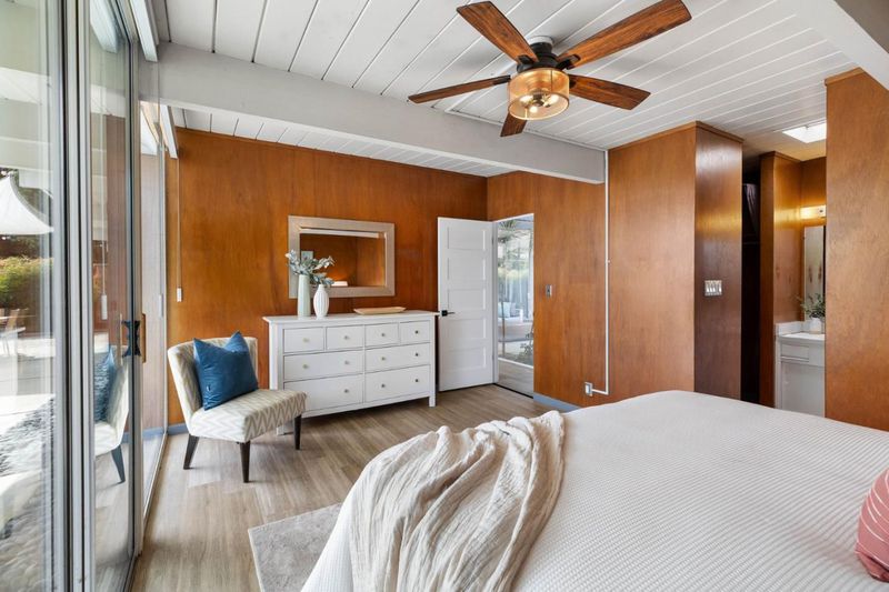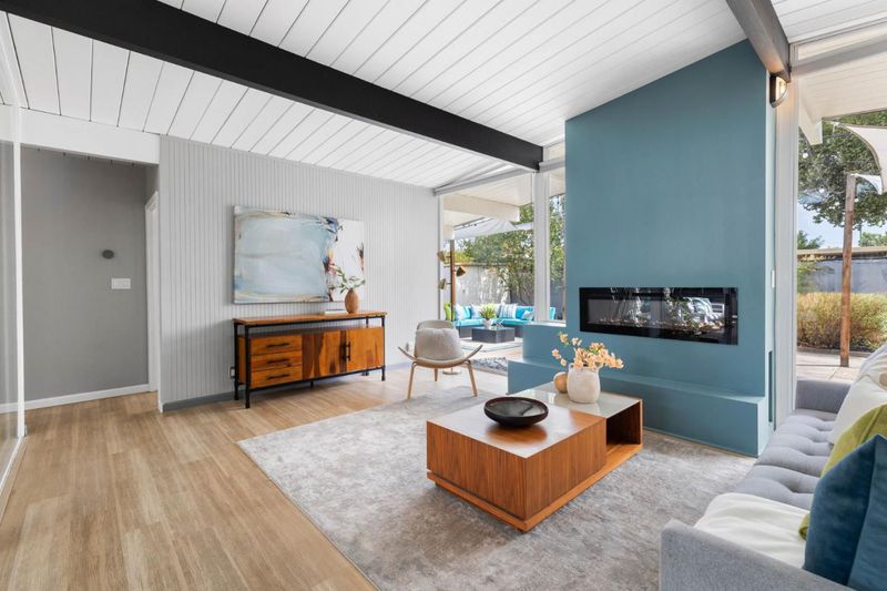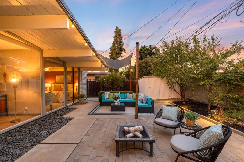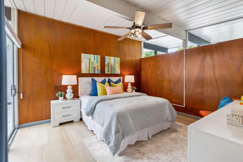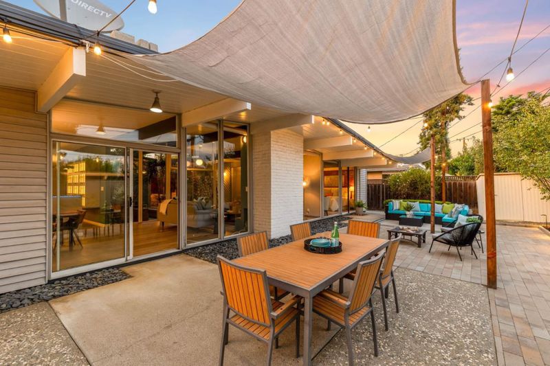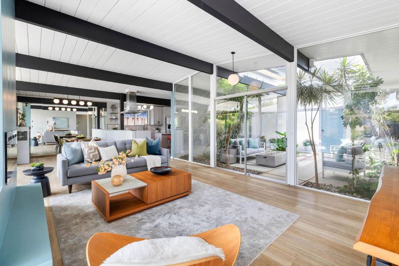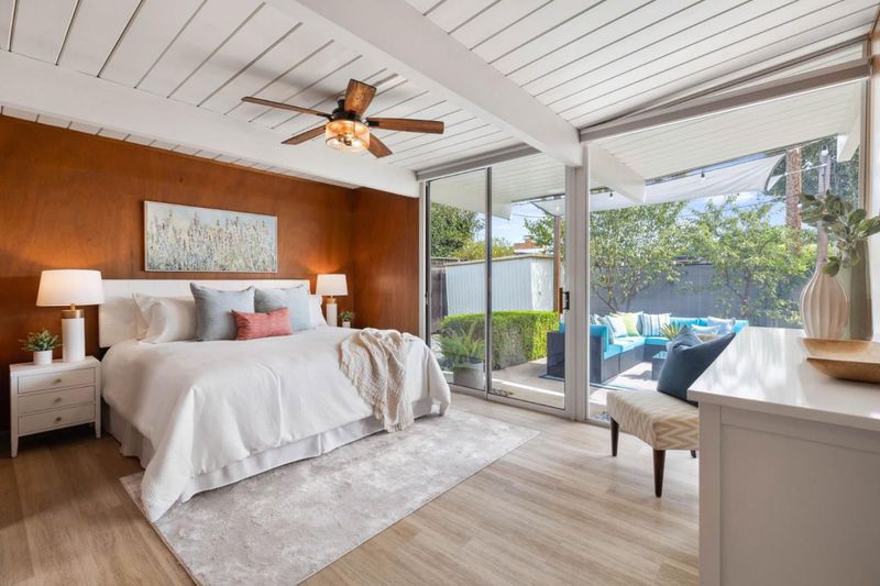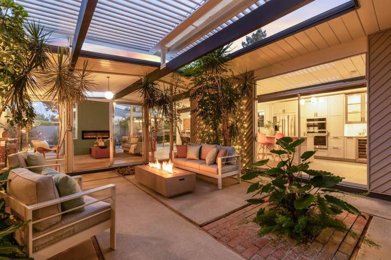 Gorgeous home designed by Joseph Eichler in Historic Fairglen Neighborhood where Mid-century modern meets today's luxury in this beautifully updated 5BR/3BA home. This home features a fully remodeled kitchen with high end/wi-fi enabled smart appliances, Miele hood & dishwasher, Bosch fridge, GE Monogram induction cooktop & oven with air-fry, built-in microwave, quartz countertops, custom cabinetry, and tile backsplash that echoes Eichler's signature aesthetic. Smart home features abound, including smart switches, GE Whole House Water with water consumption, vacation, & everyday leak sensor through an app, smart lighting, & more. Energy efficient upgrades include owned Tesla Solar & Battery system, 220V EV charger, a three-zone control Viessmann radiant heating system for optimal comfort and efficiency. A newly added 5th bedroom with ensuite bath & private entrance offers flexible living options. Enjoy designer bathrooms with the primary ready for your personal touch, organized custom closets, upgraded electrical panel, and beautifully drought tolerate landscaped front & backyard. All while staying true to the classic Eichler aesthetic atrium entry with unique louvred roof, original mahogany paneling, globe lighting, and iconic open-concept living with abundance of natural light.