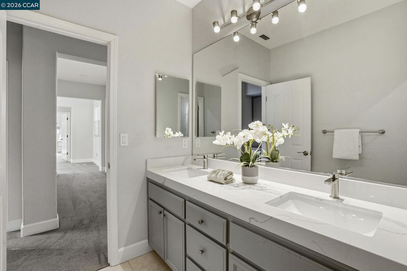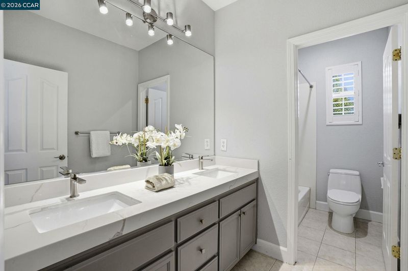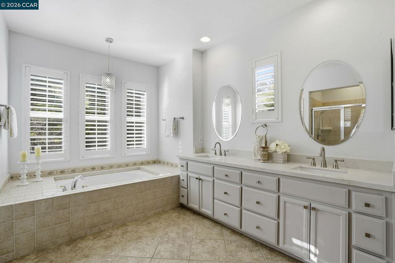 - Shower Over Tub, Solid Surface, Tile, Updated Baths, Double Vanity, Window