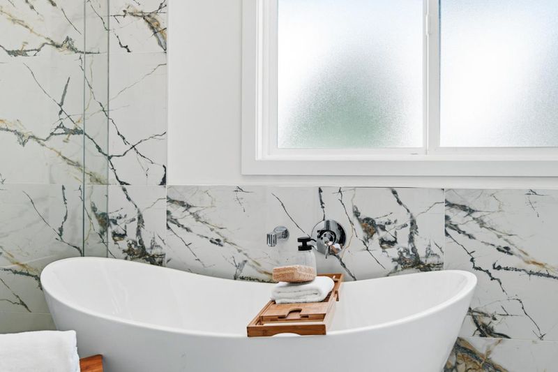 - Double Sinks, Full on Ground Floor, Primary - Stall Shower(s), Shower and Tub, Stone, Tile, Tub in Primary Bedroom