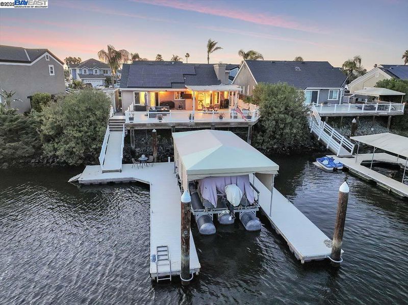 WATERFRONT LIVING AT IT'S BEST! STUNNING UPDATED SINGLE-STORY W/PRIME EASTERN EXPOSURE - LARGE ENTERTAINERS BACK DECK W/GLASS RAILING, OVERHANG FOR YEAR-ROUND USE - OVERSIZED DOUBLE DOCK PLUS SIDE TIE W/CANVAS COVER OVER HYDRO HOIST PLUS JET SKI RAMP - PAID SOLAR - DESIGNER TOUCHES THROUGHOUT - Open concept living area w/laminate/stone flooring throughout major living area - Updated chef's kitchen w/SS appliances and eat at bar - Great room w/high volume ceiling, updated designer electric fireplace w/custom mantel & wet bar w/mini refrigerator - Primary master w/water view, updated bath w/custom shower, dual bowl sinks & 3 closets - 2 additional secondary bedrooms & bath with updated fixtures and touches - Stamped concrete driveway & walkway - plumbed for hot tub - side yard w/2 sheds - Meticulously maintained - All this and more - This one will not last!!!
