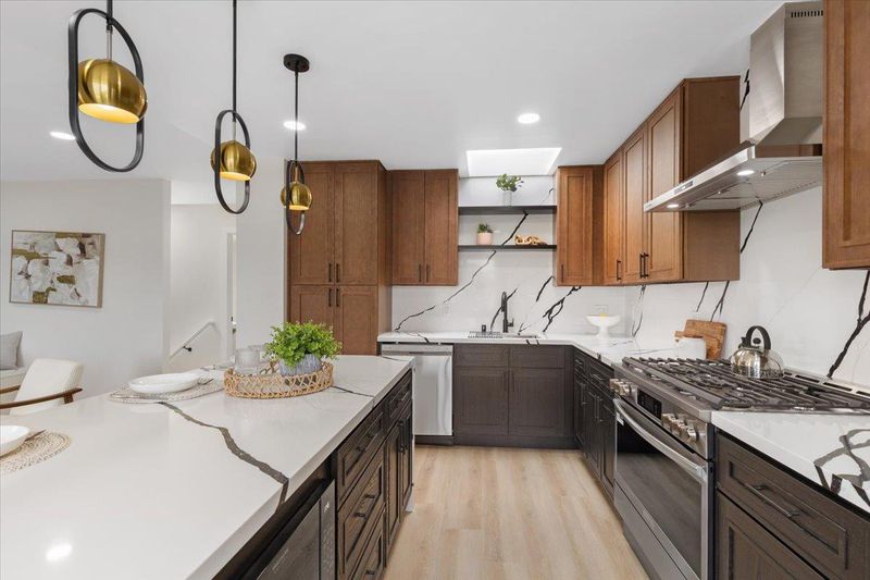 - Cooktop - Gas, Countertop - Quartz, Microwave, Oven Range - Gas, Pantry, Refrigerator, Skylight
