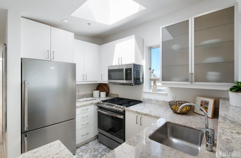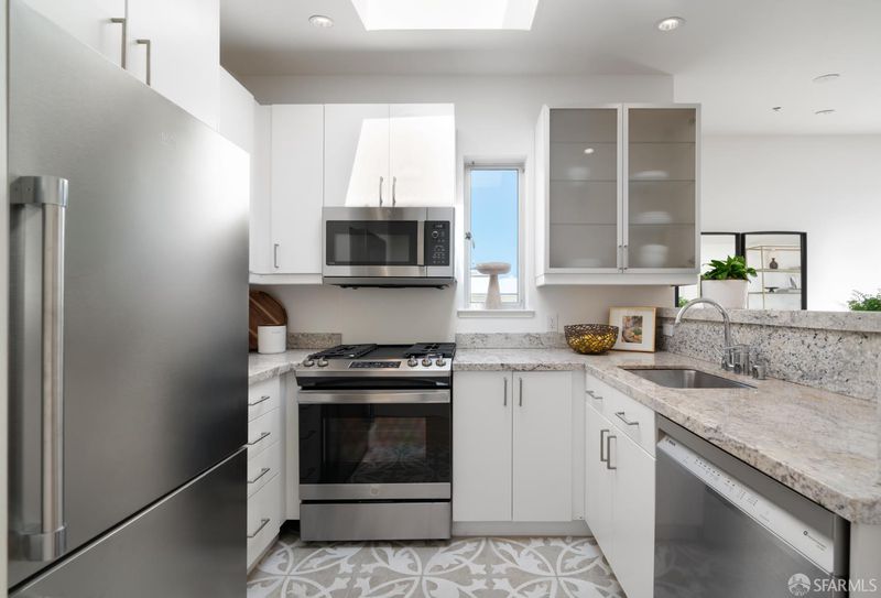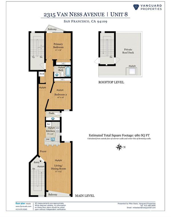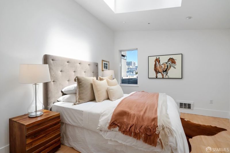 2315 Van Ness is a top-floor condominium in a boutique 8-unit building. The property features exceptional natural light and a large private roof deck with full span Golden Gate Bridge views. The residence includes two bedrooms and one and a half bathrooms across 980 square feet of living space. The home offers an open-plan living and dining area with views of Russian Hill, a gourmet kitchen with stainless steel appliances and bar seating, in-unit washer and dryer, two balconies, and built-in closets. This premier Cow Hollow location is a short distance from the vibrant restaurants, boutiques, and entertainment offered by Union and Polk Street. It's also within close proximity to Fort Mason, Aquatic Park Cove, & Marina Green.