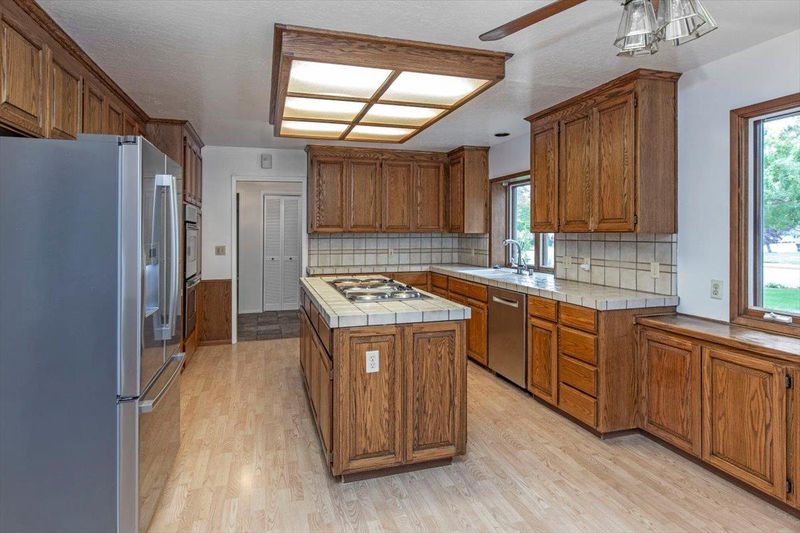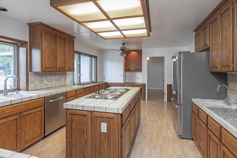 - 220 Volt Outlet, Countertop - Marble, Countertop - Tile, Dishwasher, Exhaust Fan, Garbage Disposal, Island with Sink, Oven - Built-In, Oven - Double, Refrigerator